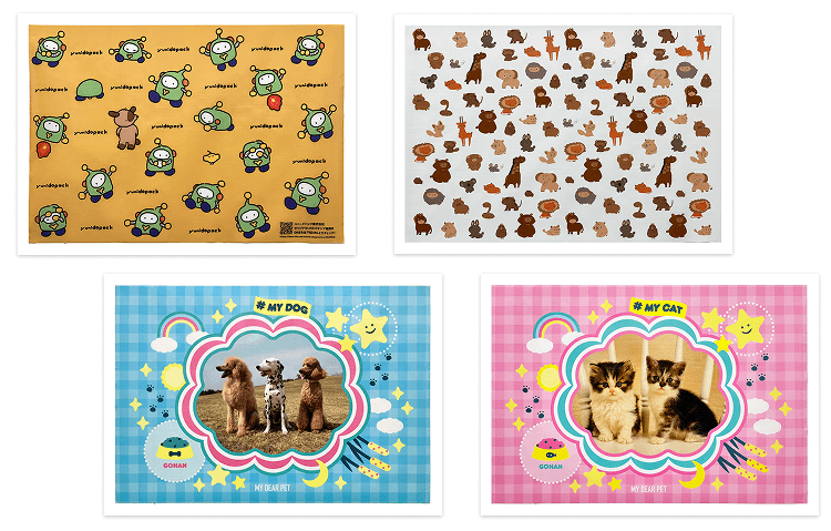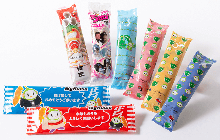 軟包装のデジタル印刷技術を活かし、駄菓子、レジャーシート、ポリ袋、養生テープ、クラフト封筒など、多種多様なオリジナル商品を小ロットで製作できます。デザイン入稿だけでなく、デザイン作成からのご依頼も承ります。
