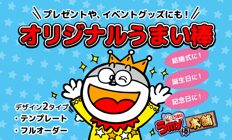 駄菓子の銘品「うまい棒」をオリジナルパッケージで制作!結婚式や記念日、イベントでの配布、お誕生日や推し活動など、幅広い用途でご活用いただけ、ユニードパックで一番人気の商品です。